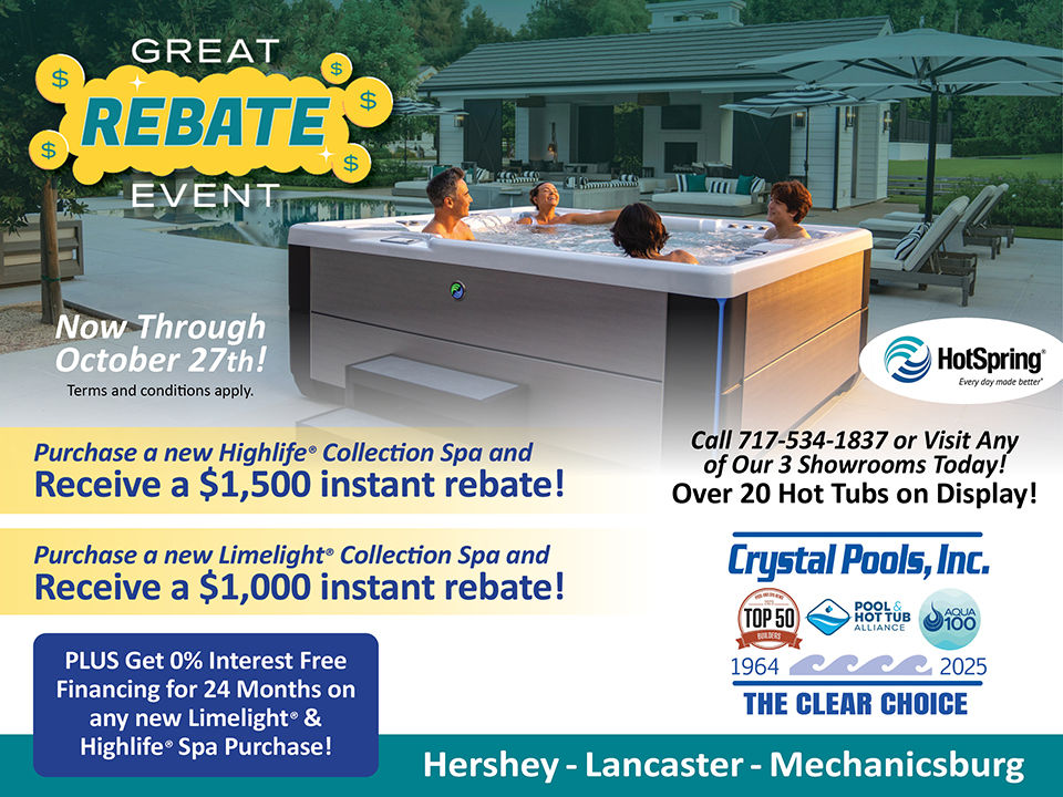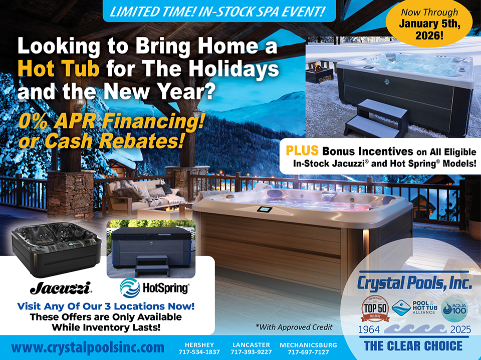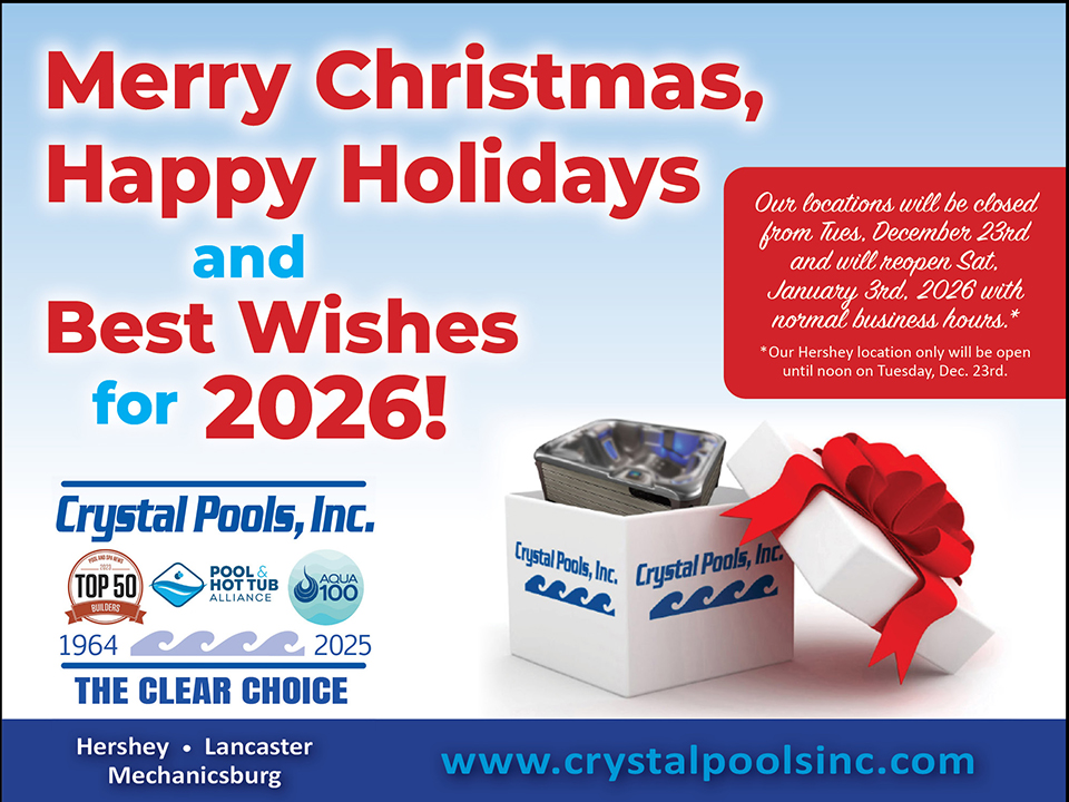 As one of the 2025 Top 50 Pool Builders in the United States, Crystal Pools is Central Pennsylvania’s “Clear Choice” for professionally-installed inground and above ground swimming pools, hot tubs and swim spas. Honored in June 2025 by the Pool and Spa News Magazine and Hayward Pool Products, Inc., Crystal Pools was once again nationally recognized as a Top 50 Pool Builder for our completed inground pool construction projects. We offer a complete line of pool chemicals and supplies at our three retail locations in Hershey / Elizabethtown, Lancaster and Mechanicsburg and have a hot tub showroom and an outdoor pool park, featuring fully-operational above ground and inground pools, at each location.