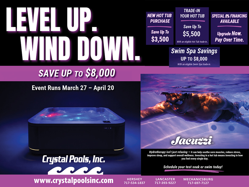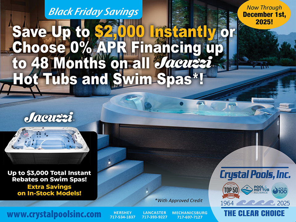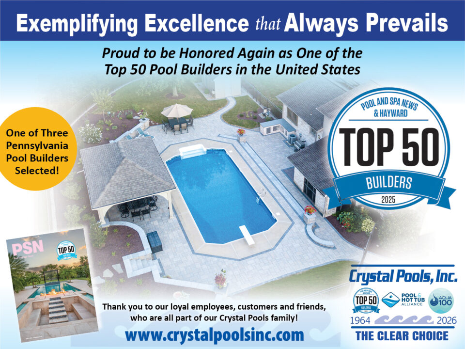 As one of the 2025 Top 50 Pool Builders in the United States, Crystal Pools is Central Pennsylvania’s “Clear Choice” for professionally-installed inground and above ground swimming pools, hot tubs and swim spas. Honored in June 2025 by the Pool and Spa News Magazine and Hayward Pool Products, Inc., Crystal Pools was once again nationally recognized as a Top 50 Pool Builder for our completed inground pool construction projects. We offer a complete line of pool chemicals and supplies at our three retail locations in Hershey / Elizabethtown, Lancaster and Mechanicsburg and have a hot tub showroom and an outdoor pool park, featuring fully-operational above ground and inground pools, at each location.