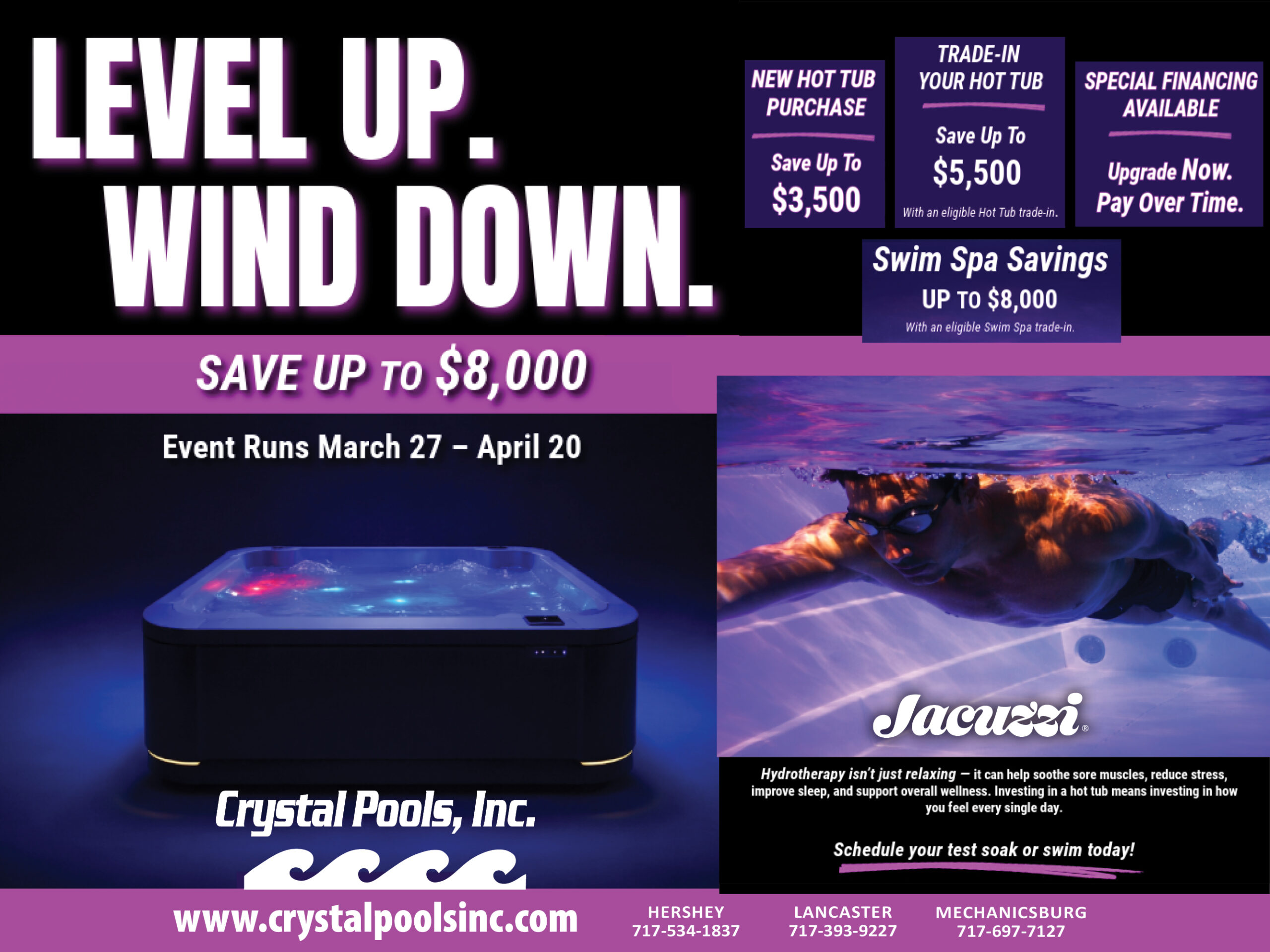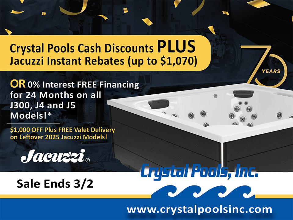 Relax and unwind with a professionally installed hot tub from Crystal Pools. Leading brands include Jacuzzi®, Hot Spring® and Freeflow Spas®. Choose from over 25 models with customized features and budget-friendly financing available!